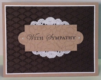 Masculine cards of any sort are tough for me but this sympathy card came together rather quickly. The mother of our neighbor across the street passed away last week so I needed to make a card for them. It was his mother so I didn’t want to go with too many flowers or anything. I do have flowers on the card and of course the doily and pearls but I think overall it’s an ok card for a guy, don’t you?